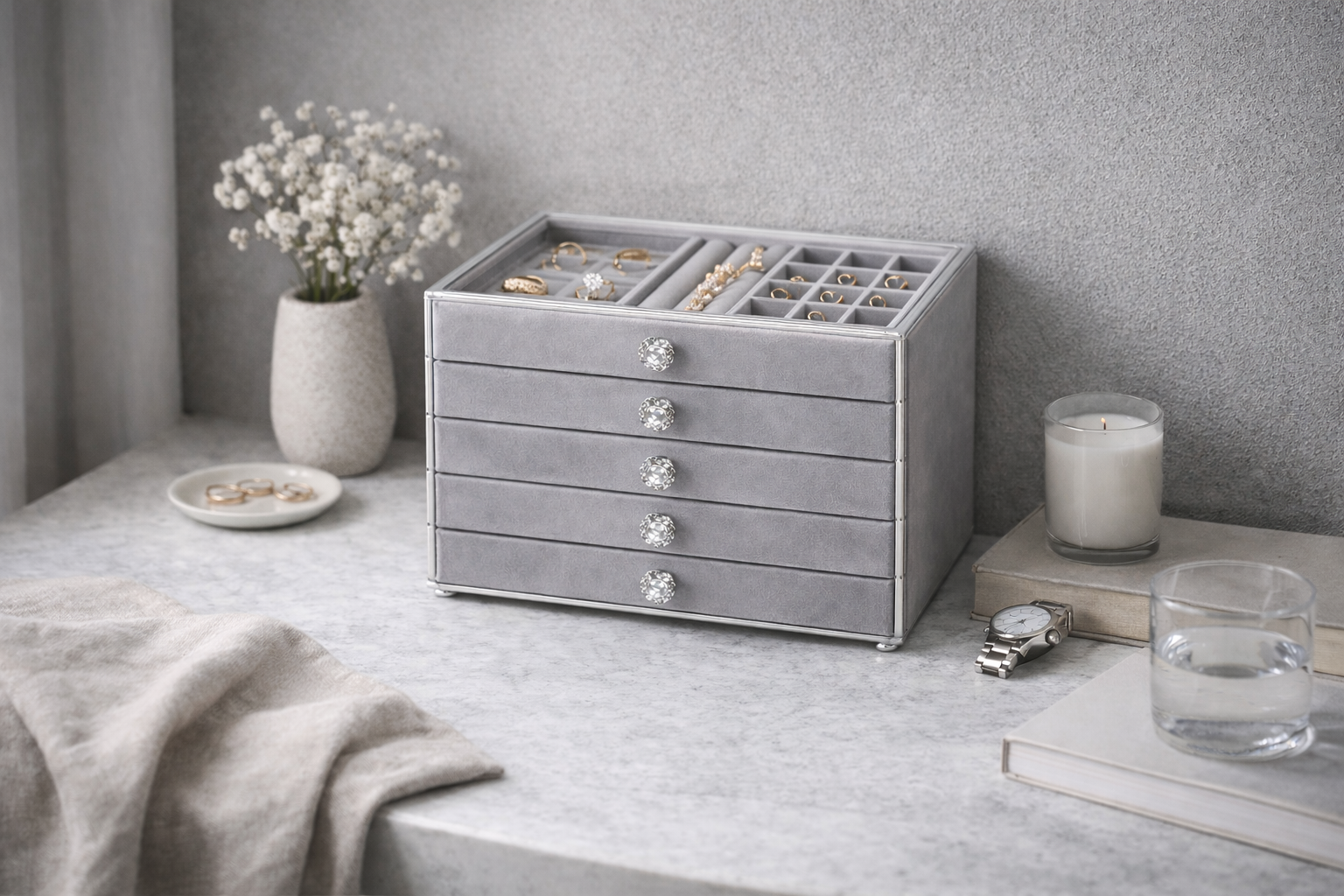 Diese exklusive fünfstöckige Diamanten-Schmuckbox vereint zeitlose Eleganz mit erstklassiger Verarbeitung und bietet eine luxuriöse Lösung zur stilvollen Aufbewahrung wertvoller Schmuckstücke. Gefertigt aus hochwertigen Materialien überzeugt sie durch ihre stabile, langlebige Konstruktion und ein edles Erscheinungsbild, das jedem Raum eine besondere Note verleiht. Das samtweiche Innenfutter schützt Ringe, Ketten, Armbänder und Ohrringe zuverlässig vor Kratzern und Abnutzung, während die präzise gearbeiteten Schubladen eine übersichtliche und komfortable Organisation ermöglichen. Die funkelnden, diamantähnlichen Griffe unterstreichen den exklusiven Charakter der Box und sorgen gleichzeitig für ein angenehmes Handling. Durch die harmonische Kombination aus klaren Linien, eleganter Samtoptik und hochwertigen Details wird diese Schmuckbox nicht nur zu einem funktionalen Aufbewahrungsobjekt, sondern zu einem stilvollen Design-Element. Sie steht für Qualität, Ästhetik und Liebe zum Detail und eignet sich ideal für anspruchsvolle Schmuckliebhaberinnen oder als hochwertiges Geschenk für besondere Anlässe.